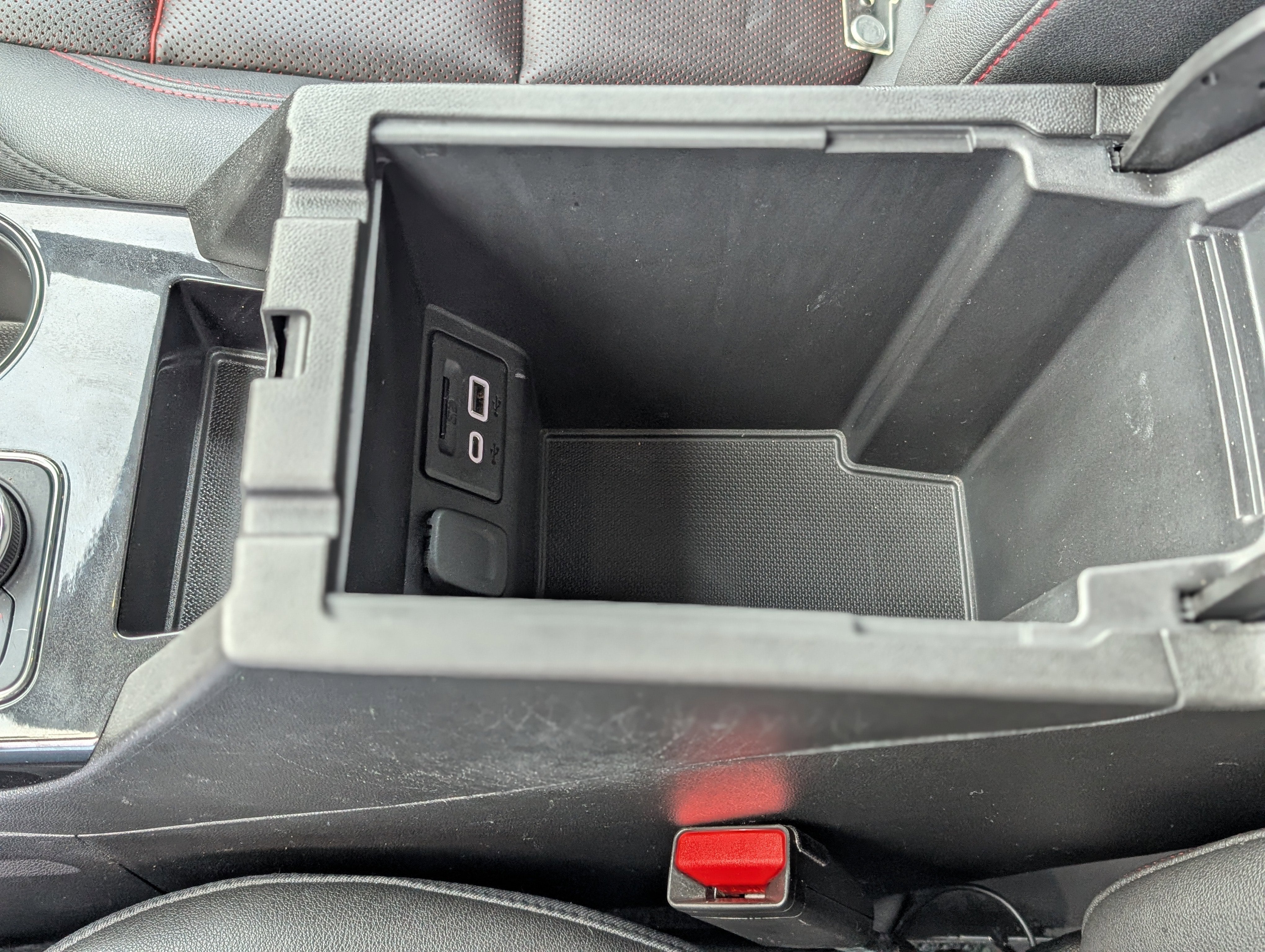 - USB data ports, 2, one type-A and one type-C includes SD Card Reader, auxiliary input jack, located within front center storage bin